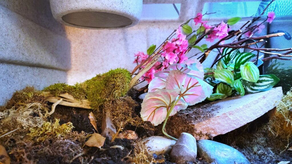 Incorporating live plants into the enclosure can help increase humidity naturally. Simply put, plants release moisture through transpiration, which contributes to the overall humidity.