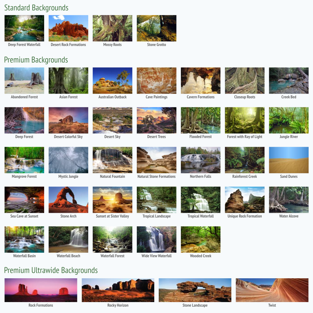 Choose an option Deep Forest Waterfall (+...) Desert Rock Formations (+...) Mossy Roots (+...) Stone Grotto (+...) Abandoned Forest (+...) Asian Forest (+...) Australian Outback (+...) Cave Paintings (+...) Cavern Formations (+...) Closeup Roots (+...) Creek Bed (+...) Deep Forest (+...) Desert Colorful Sky (+...) Desert Sky (+...) Desert Trees (+...) Flooded Forest (+...) Forest with Ray of Light (+...) Jungle River (+...) Mangrove Forest (+...) Mystic Jungle (+...) Natural Fountain (+...) Natural Stone Formations (+...) Northern Falls (+...) Rainforest Creek (+...) Rock Formations (+...) Rocky Horizon (+...) Sand Dunes (+...) Sea Cave at Sunset (+...) Stone Arch (+...) Stone Landscape (+...) Sunset at Sister Valley (+...) Tropical Landscape (+...) Tropical Waterfall (+...) Twist (+...) Unique Rock Formation (+...) Water Alcove (+...) Waterfall Basin (+...) Waterfall Beach (+...) Waterfall Forest (+...) Wide View Waterfall (+...) Wooded Creek (+...)
