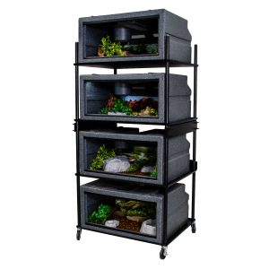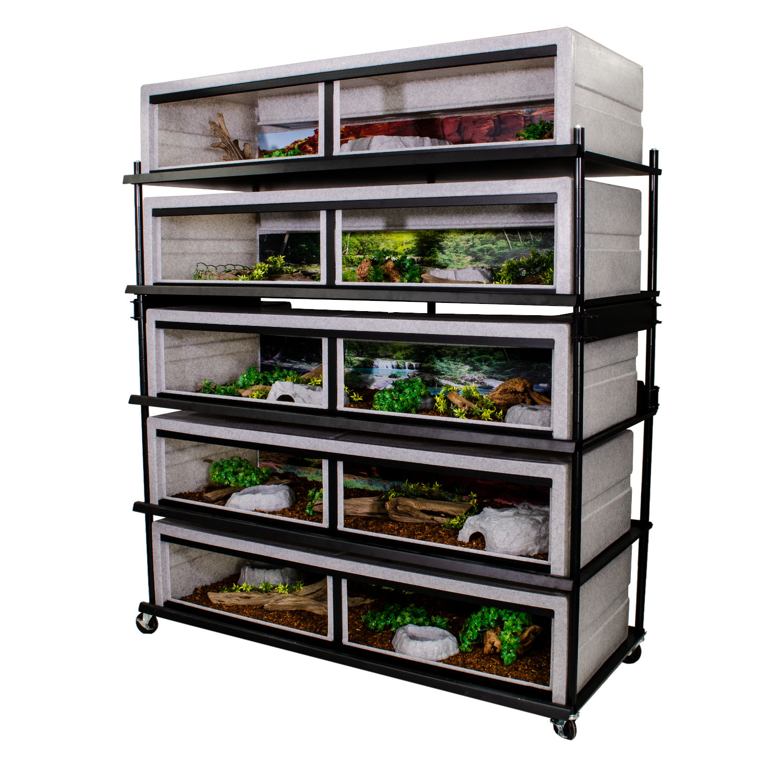 You can get just the shelf or get the shelf and 5 Model 600 cages, or the full décor package including bark, roots, plants, bowls, and more.