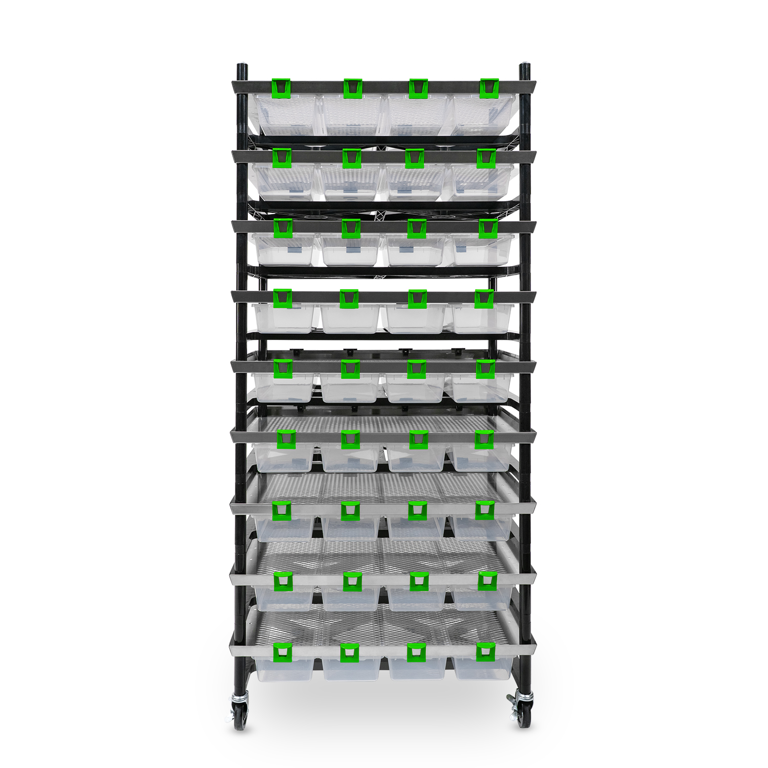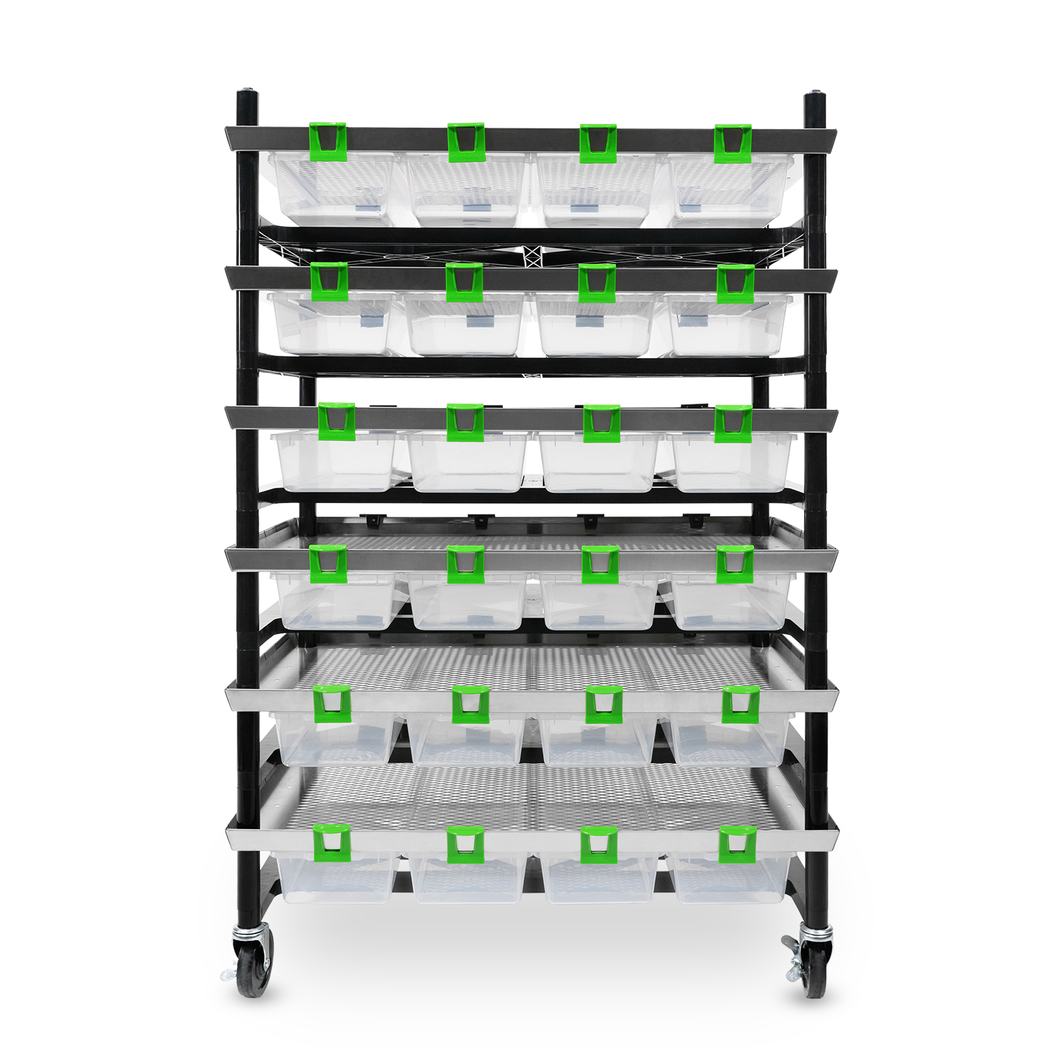 Each shelf is a single piece of stainless steel, much stronger than the often-used welded wire shelves. Unlike welded wire, our stainless steel shelves don’t rust or deteriorate over time. We also developed a unique hole pattern punched into the shelf, optimizing strength, airflow, and allowing easy food access for your rodents.