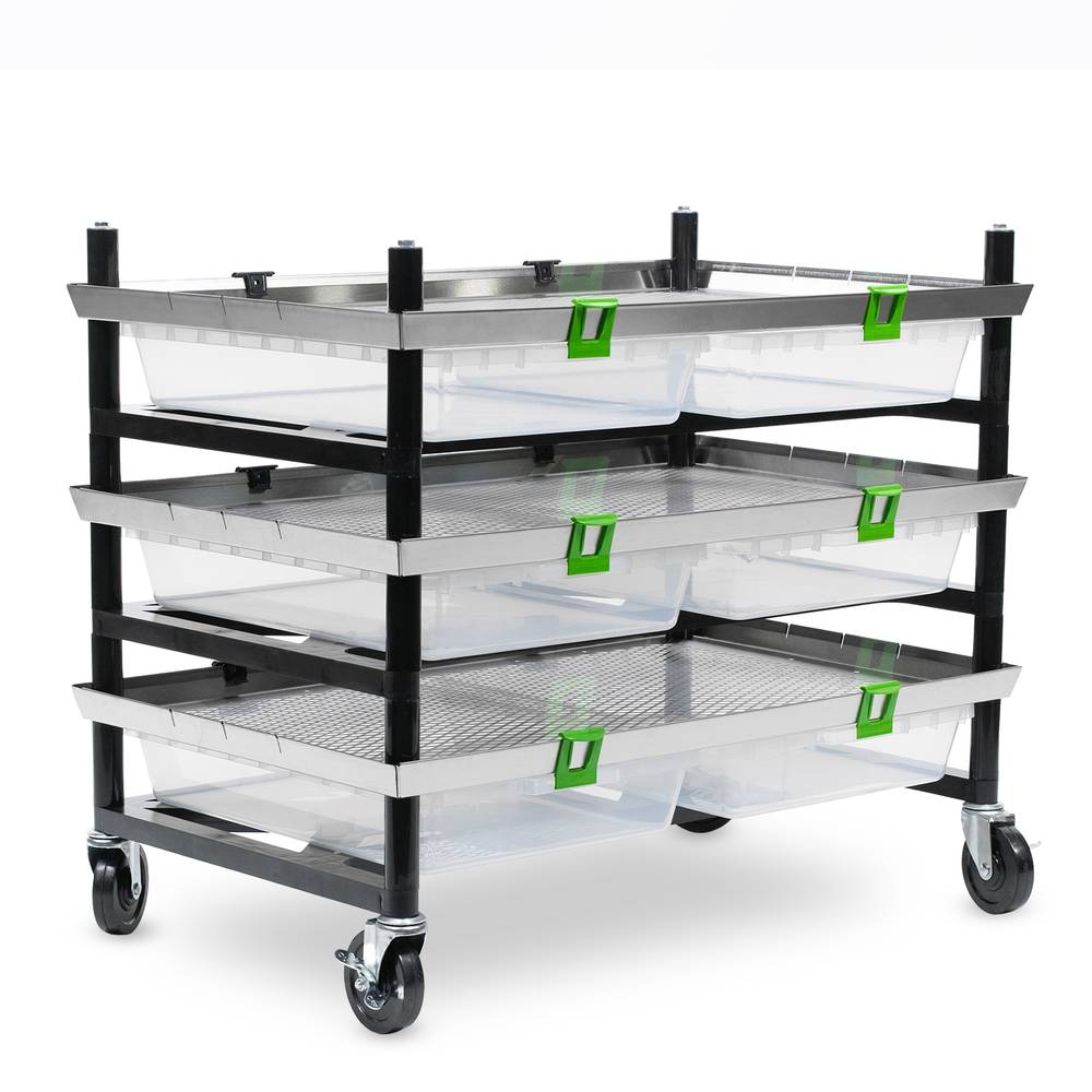 We offer a gravity-fed watering system with a jug on top of the rack, connected tubing, and nozzles that protrude into the tubs.