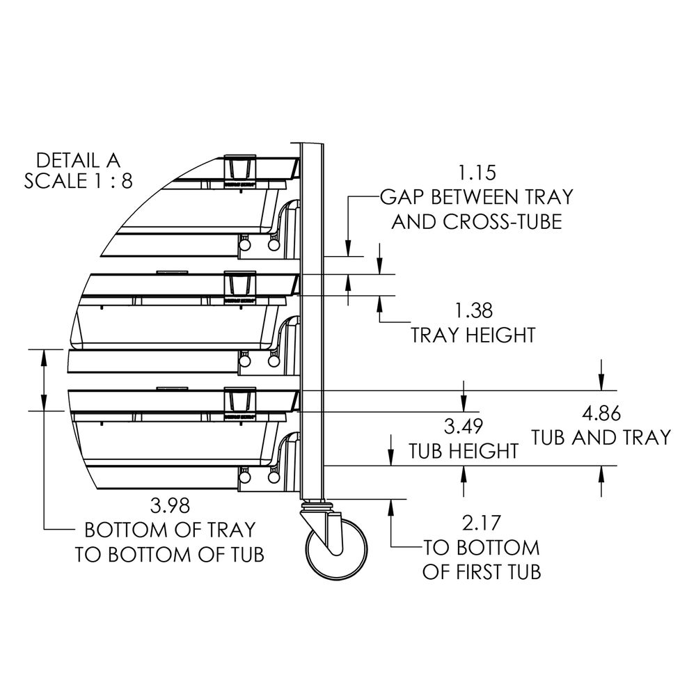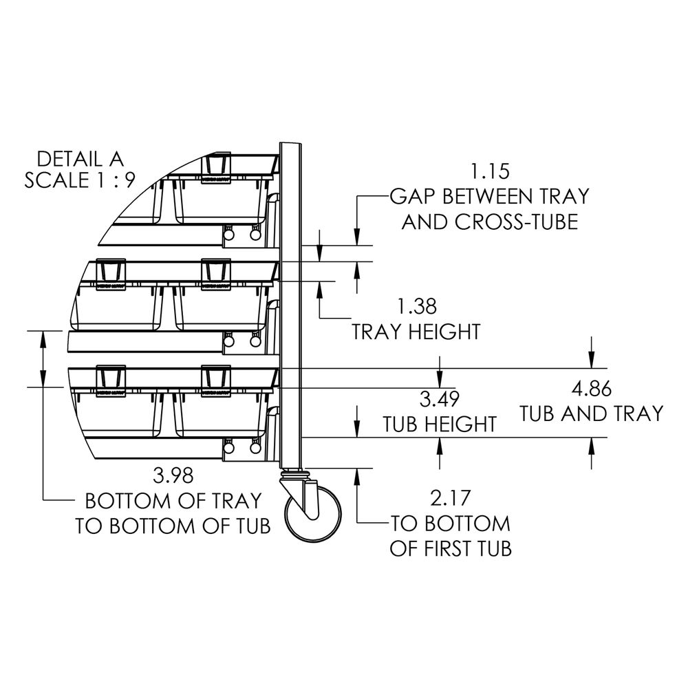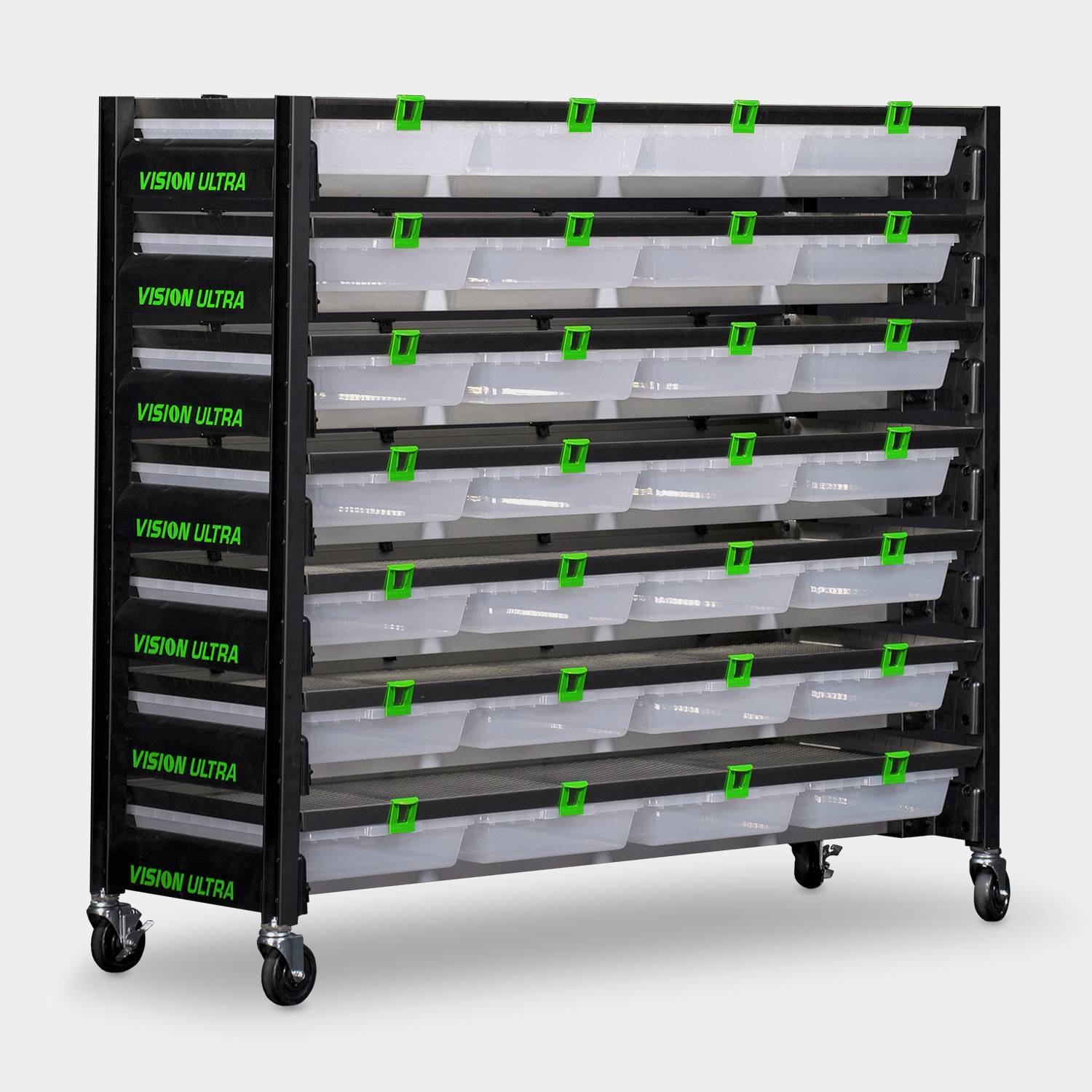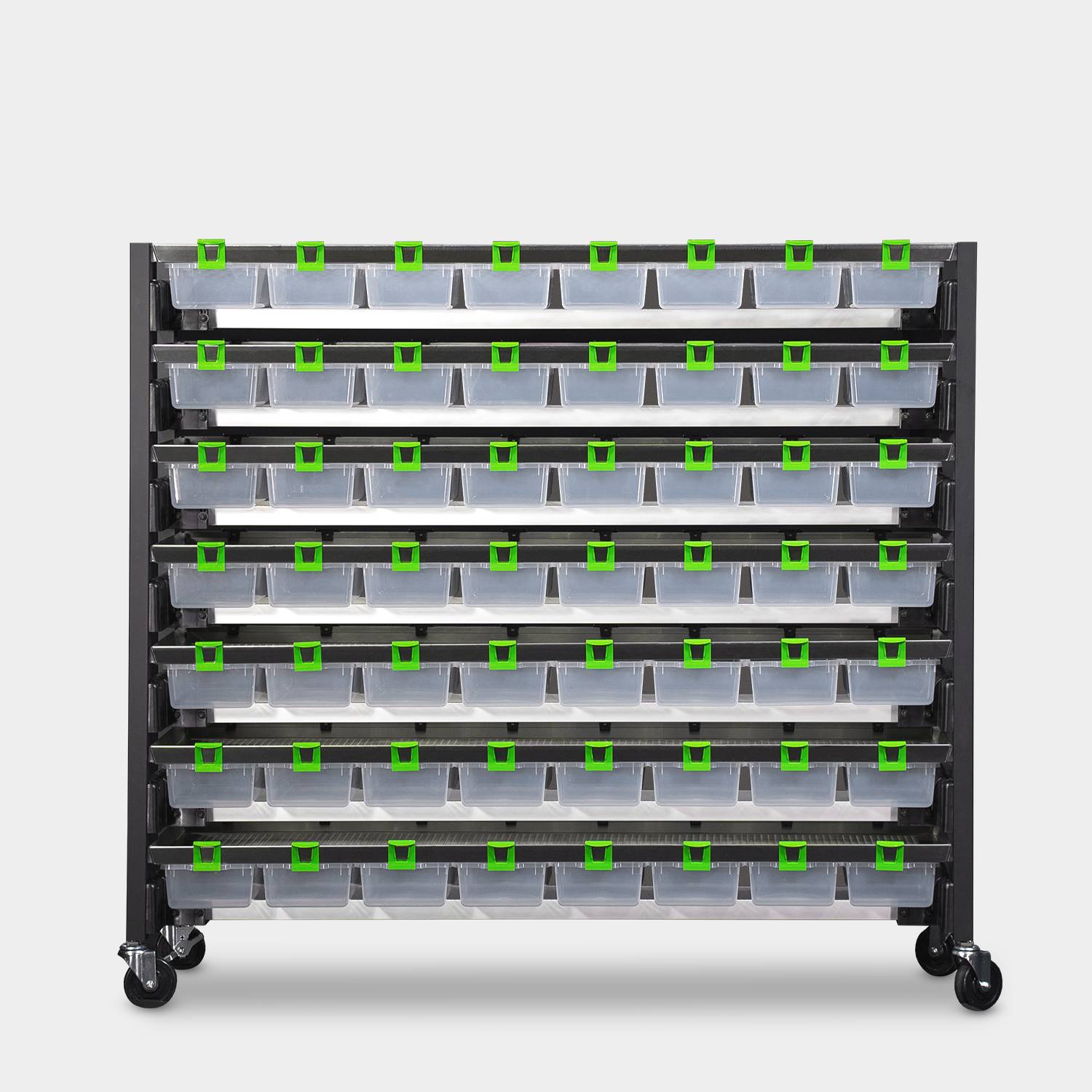 V-18 Tubs (3.5″H x 7.375″W): 7 shelves, 8 tubs per level
