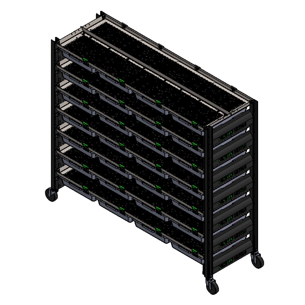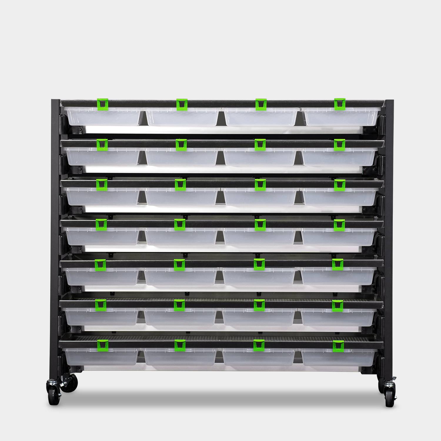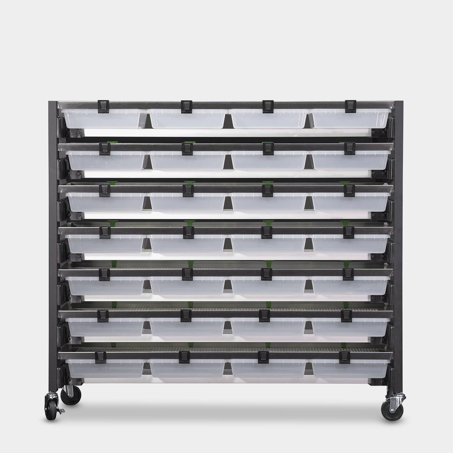 V-35s Tubs (3.5″H x 15″W): 7 shelves, 4 tubs per level